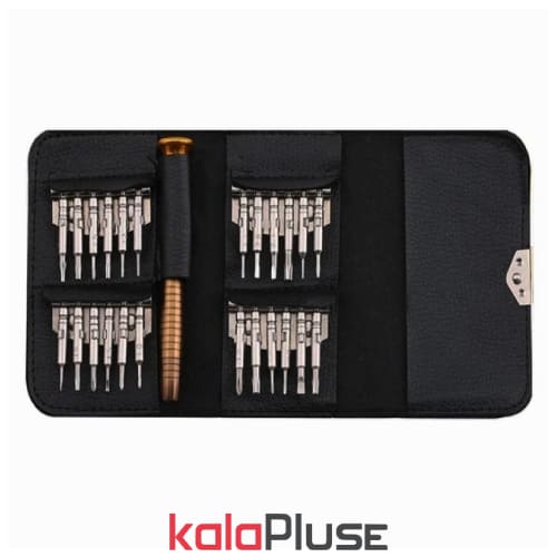 ست پیچ گوشتی کیف چرمی 25 PCS یک مجموعه کاربردی و قابل حمل است که شامل 24 عدد سری پیچگوشتی باکیفیت بالا میباشد. این محصول با طراحی کوچک و کیف چرمی جمعوجور، گزینهای مناسب برای تعمیرات دقیق و ظریف است.